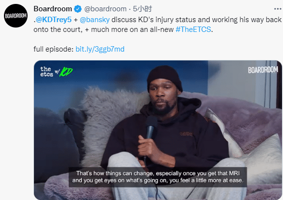 杜兰特身穿连帽卫衣和灰色运动裤出镜,戴着一顶黑色的针织帽,伤后首次亮相。