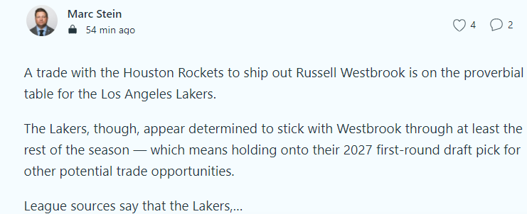 此前Marc Stein曾报道火箭愿意用沃尔换威少,并且向湖人索要2027年首轮选秀权,如今该记者再次爆料,Marc Stein表示,湖人队似乎已经下定决心至少在本赛季余下的时间里与威少并肩作战,他们将保留2027年首轮选秀权,寻找其他潜在的交易机会。