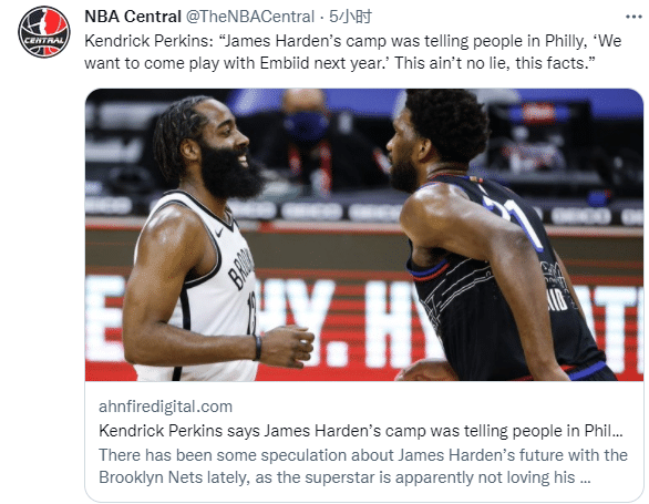 曝哈登表态想联手恩比德!帕金斯:若我是哈登,我早已准备好离开