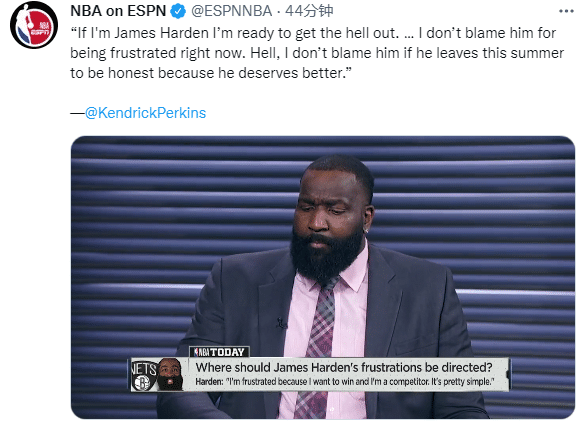 帕金斯表示哈登现在的处境很简单,他就是对篮网现状感到沮丧,他是一个重感情的人,但他最想要的是一个总冠军;帕金斯还在节目中表示:如果我是詹姆斯-哈登,我已经准备好离开了,我不怪他现在很沮丧。说实话,如果他今年夏天离开,我不会责怪他,因为他应该得到更好的待遇。