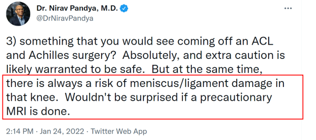 另一位医学专家Nirav Pandya则表示,汤普森的膝盖始终存在半月板/韧带损伤的风险,如果勇士对他进行预防性的核磁共振检查,不会令人感到惊讶。