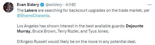Shams还透露,目前湖人在交易市场上寻求后场的升级,他们对德章泰-穆雷、布鲁斯-布朗、罗齐尔和泰厄斯-琼斯表达出了兴趣。拉塞尔有可能在任何潜在的交易中被送走。