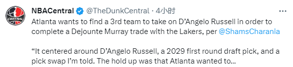 据名记Shams在节目中透露,老鹰希望找到第三方球队来接收拉塞尔,以和湖人完成穆雷的交易,表示:我被告知,湖人队的交易主体是拉塞尔、一个2029年的首轮签以及一个选秀签互换,现在阻碍是老鹰想为拉塞尔寻找第三方球队,老鹰想用拉塞尔换来一份到期合同;预计双方将在交易截止日继续进行谈判。