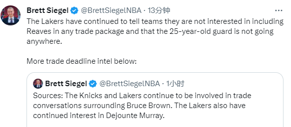 穆雷的名字与湖人联系在一起,洛杉矶被穆雷视为首选的目的地;该记者还表示,湖人继续向其他的球队表明,他们没有兴趣把里夫斯放入到任何的交易中,里夫斯哪都不会去。