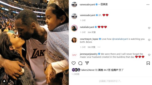 科比81分之夜16周年!瓦妮莎晒两人亲吻照,ESPN重温经典广告