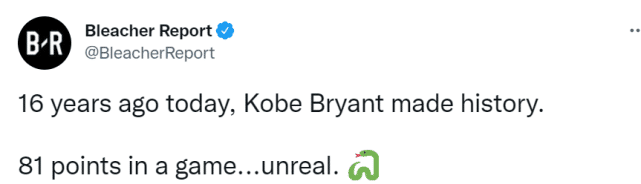 美媒Bleacher Report晒出了科比当时的数据:81分,46投28中,三分13投7中,罚球20罚18中。他们还配文写道:“16年前的今天,科比-布莱恩特创造了历史,一场比赛81分,太不现实了!”