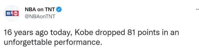Bleacher Report也晒出了科比当年自己谈论81分的言论。“(一场得到81分)甚至不曾在我的梦中出现。但这就是发生了,很难解释……”TNT也发文表示,81分之战是一场难以忘怀的经典表演。