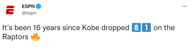 ESPN写道:“距离科比在猛龙身上轰下81分,已经过去16年了。”随后,他们晒出了科比和贾伦-罗斯关于81分的经典广告。广告的设置非常有趣,已经退役的两人在一家酒店里相遇。罗斯从科比身边经过时,被科比叫住了。听到这个熟悉的声音,罗斯只能一脸无奈地回头寒暄。