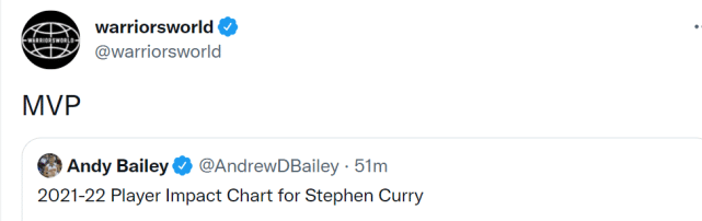Warriorsworld转发了Andy Bailey的数据,评论道:“MVP!”库里近期的表现,让他的MVP呼声有所下降。不过,他依然在讨论范围内,大家认为本赛季的MVP最终会花落谁家呢?