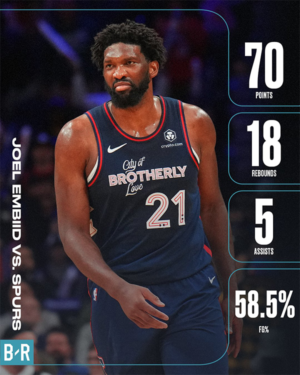 恩比德一战刷爆纪录——单场70分超越张伯伦(68分)成为76人队史单场得分王;成为现役第4位70分先生,NBA历史上第9位70分先生,更是成为史上第一位单场至少70分15篮板5助攻的球