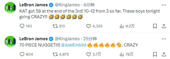 今日NBA迎来数据爆发日,恩比德狂砍70分18篮板之后唐斯全场35投21分、三分15中10狂砍62分8篮板,詹姆斯发声狂赞恩比德和唐斯:恩比德70分,太疯狂了,唐斯三节58分,三分球12中10,这些男人今晚太疯狂了。