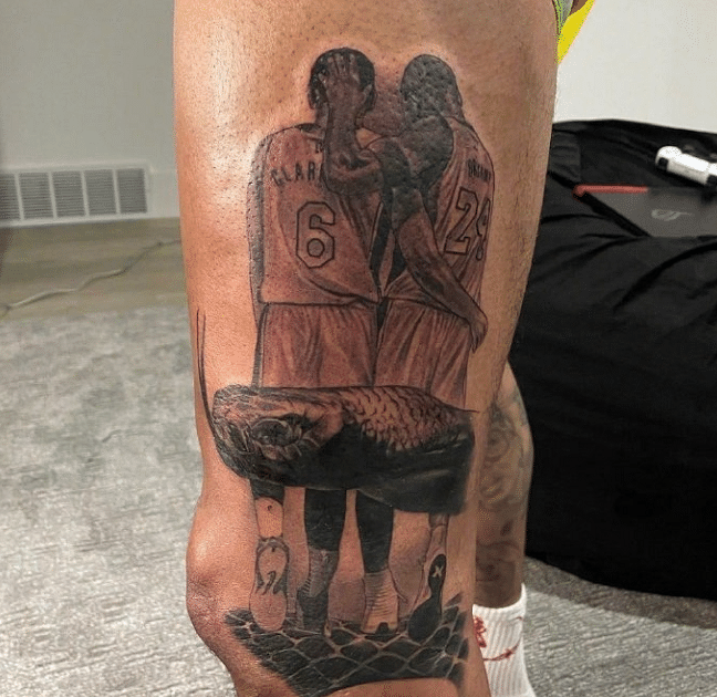克拉克森的纹身有很多,其中不乏有艾弗森跨过泰伦卢的经典瞬间,不过作为前湖人球员,这样的行为也一度引发争议。而现在他将自己的恩师、前队友科比纹在身上,很暖心。