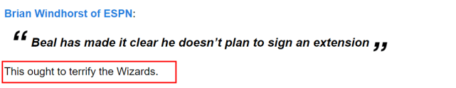 美媒NBC体育认为,比尔的决定将吓坏奇才。虽然比尔仍然很有可能留在奇才,只是经济方面的因素推迟续约,但比尔也有可能为自己的未来自私一把,成为自由球员后再决定去留。比尔曾说过想穿着奇才球衣退役,但类似的话,浓眉效力鹈鹕时也曾说过,他现在已经在为湖人打球。