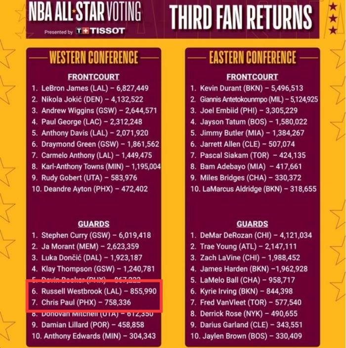 在第一轮投票结束时,保罗的票数还领先威少10万票左右。而来到第二轮,威少已经完成对保罗的反超,领先保罗1万票左右。如今来到第三轮,威少完成了对于保罗的彻底超越,领先保罗来到接近10万票。如果不出意外,威少在球迷选票上肯定会领先保罗。