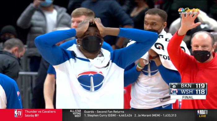 这是一次关键吹罚,奇才丢掉球权,随后阿德为篮网打进关键一球,篮网领先4分;生死时刻,库兹马投进续命三分,欧文三分打铁和哈登上篮被帽,不过奇才连续两次错失三分绝杀,最终奇才1分惜败,奇才替补席都双手抱头十分遗憾。