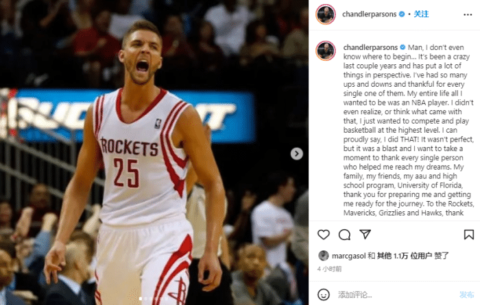 帕森斯在自己社交媒体上写道:“兄弟,我甚至不知道如何讲起我的故事...过去几年太疯狂了,我也从正确的角度审视了很多事。我经历很多起起伏伏,我很感激其中的每一次经历。我一生中唯一想做的事就是成为NBA球员。我甚至没有意识到,或者说我从没有想过,我只是想要在最高水平的比赛中上场打球。我可以自豪地说,我做到了!尽管我的生涯并不完美,这仍是一段有趣的经历,我想要在此时此刻感谢每一个曾帮助我实现梦想的人。
