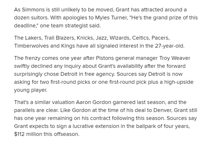 此前活塞用格兰特+萨迪克-贝+奥利尼克+一个首轮选秀权报价西蒙斯,但费城对这样的交易并没有什么兴趣;目前活塞对格兰特的要价是2个首轮选秀权或者一个首轮选秀权外加一位潜力高的年轻球员。