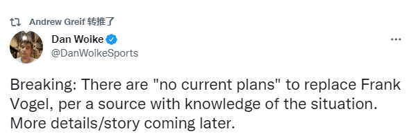 来源:24直播网01-19 10:2024直播网01月19日讯 ,此前有记者报道湖人险些解雇沃格尔,他随时都有可能下课;如今剧情反转,湖人记者Dan Woike报道,了解相关情况的消息人士透露,湖人目前没有解雇沃格尔的计划。