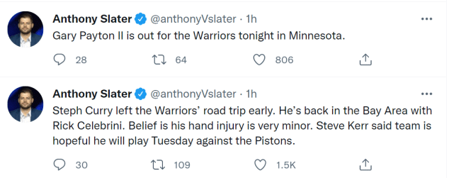 勇士记者Anthony Slater报道称,库里已经和训练师Rick Celebrini提前返回湾区,并未随队来到明尼阿波利斯。科尔表示库里的手部伤势很轻,有望在周三主场对阵活塞的比赛中复出。此前,科尔曾表示,格林也计划在那场比赛回归。勇士官方晒出了球队抵达森林狼主场后的训练视频,维金斯和别利察正在练习底角三分。