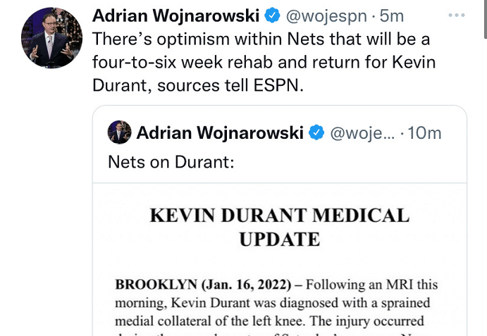 来源:24直播网01-17 11:4624直播网01月17日讯 ,篮网官宣布了杜兰特的伤情,膝盖MRI检测结果,显示杜兰特遭遇了左膝内侧副韧带扭伤,将会缺席一段时间。很快名记就透露,称内部乐观认为,杜兰特将在4-6周的康复治疗后复出。也就是说,杜兰特的伤病恢复,至少需要4-6周的时间,这期间他将无缘比赛。