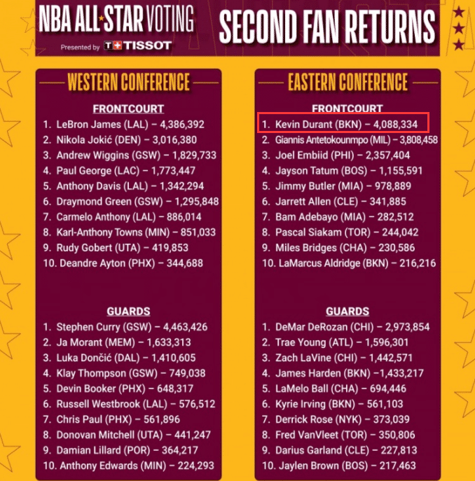 杜兰特的长期缺阵也会引发连锁反应,除了对于篮网的影响之外,NBA全明星也会受到冲击,因为2022年NBA全明星赛举办日期是当地时间2022年2月20日,只有一个月的时间了,而杜兰特的伤病几乎肯定会让他缺席,那么东部的票王归属?谁可以渔翁得利等等,看点就更多了。