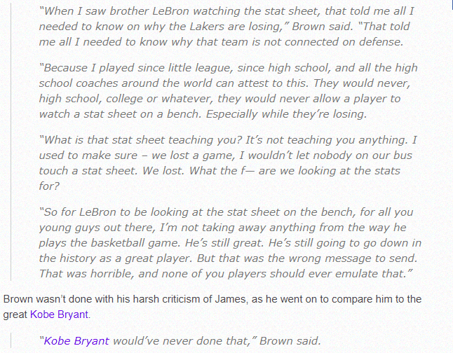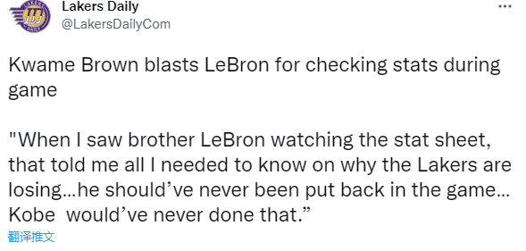 夸梅-布朗在节目中表示:当我看到勒布朗老弟在比赛中查看数据表时,这告诉了我关于湖人为什么正在输球以及湖人为什么没有防守所需要知道的一切。