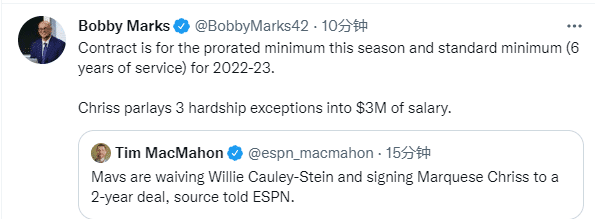 来源:24直播网01-16 12:5424直播网01月16日讯 ,名记Tim Machmahon报道,独行侠将会裁掉考利-斯坦从而腾出一个阵容名额,并与马奎斯-克里斯签订一份新的两年合同;据薪资专家Bobby Marks报道,克里斯和独行侠新签2年300万美元合约。