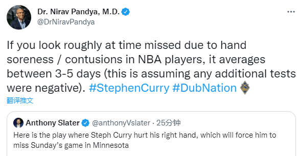 下一场对阵森林狼,库里因伤休战,本赛季第4次缺席比赛。医学专家Nirav Pandya跟进报道,库里大概需要3-5天的恢复期。
