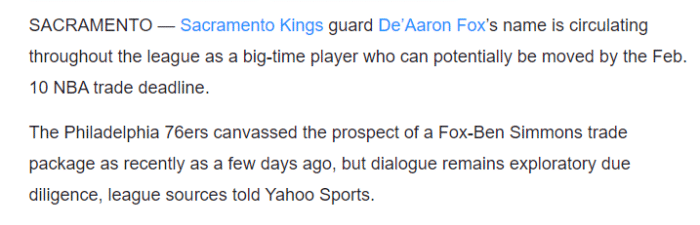第一、 据《雅虎体育》名记Chris Haynes报道,近期76人与国王就福克斯和本-西蒙斯的交易进行过商谈,但商谈只停留在探索阶段,并没有实质性的进展;之后NBA记者跟进报道,76人对福克斯换西蒙斯不感兴趣,若交易达成,需要拉入第三方。