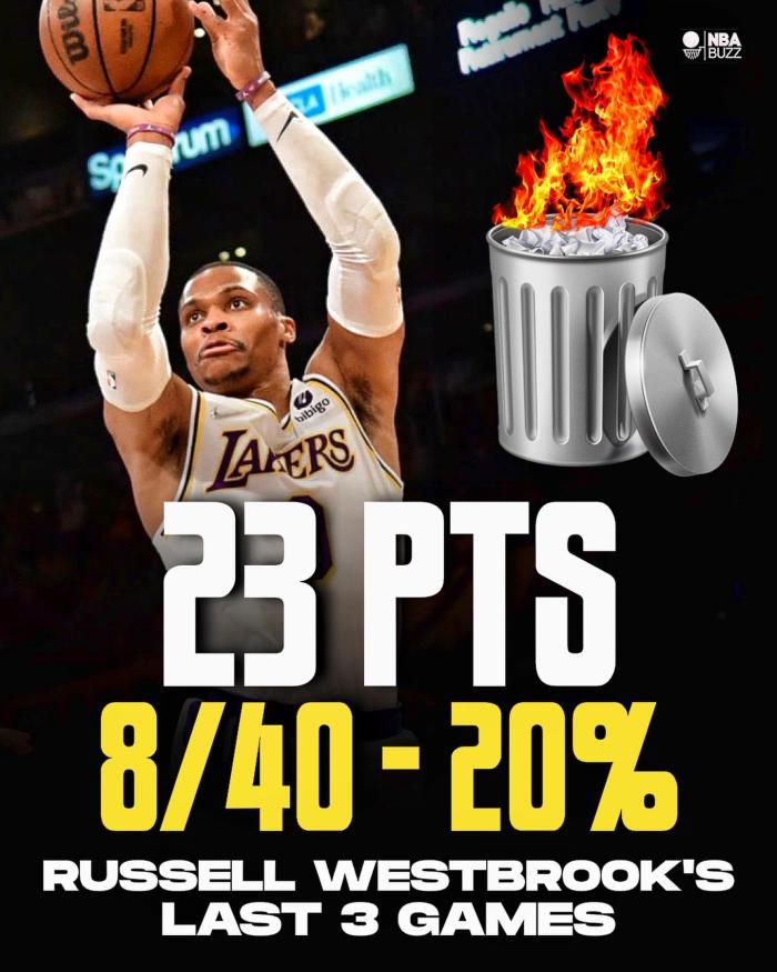 赛季至今,威少已经为湖人出战42场比赛,场均出战35.5分钟能够贡献18.7分8.2助攻8.1篮板1.1抢断,三项命中率分别是43.7%、28.8%和65.6%;最近三场比赛,威少得分都未上双,三战40投8中仅仅拿到23分,命中率只有可怜的20%。