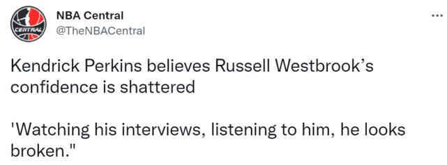 帕金斯在节目上说道:“看他的采访,听他说话,他看上去已经崩了。”输给灰熊一战,威少12投2中,而不敌国王一战,他更是14投2中。最近威少的失误降下来了,但他的投篮命中率也下来了,引起球迷们的口诛笔伐。威少还有两年的大合同,湖人很难交易走他,那么该如何修正威少的问题呢?帕金斯连支三招。