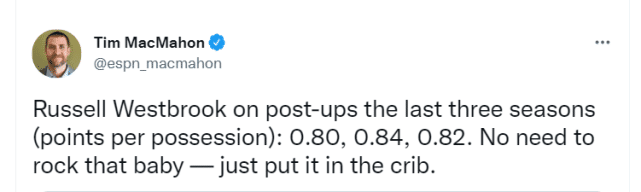 帕金斯的言论引起热议,名记Tim MacMahon转发后反对帕金斯的最后一条建议。“过去三年,威少每回合单打的得分依次是0.80分、0.84分和0.82分。”MacMahon认为威少背身单打的效率并不好,不应该尝试。无论如何,威少已经成为湖人热议的焦点人物,他的表现也直接影响着湖人的战绩。