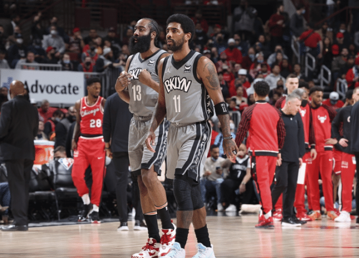 篮网大胜公牛拿下胜利,三巨头都咧嘴大笑庆祝。