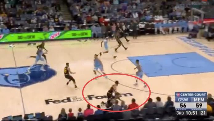 比赛进行到第三节还剩下10分52秒,勇士队转换进攻,此时的汤普森快下,因为一直关注着库里的跑位,汤普森没有注意到场边的女裁判。