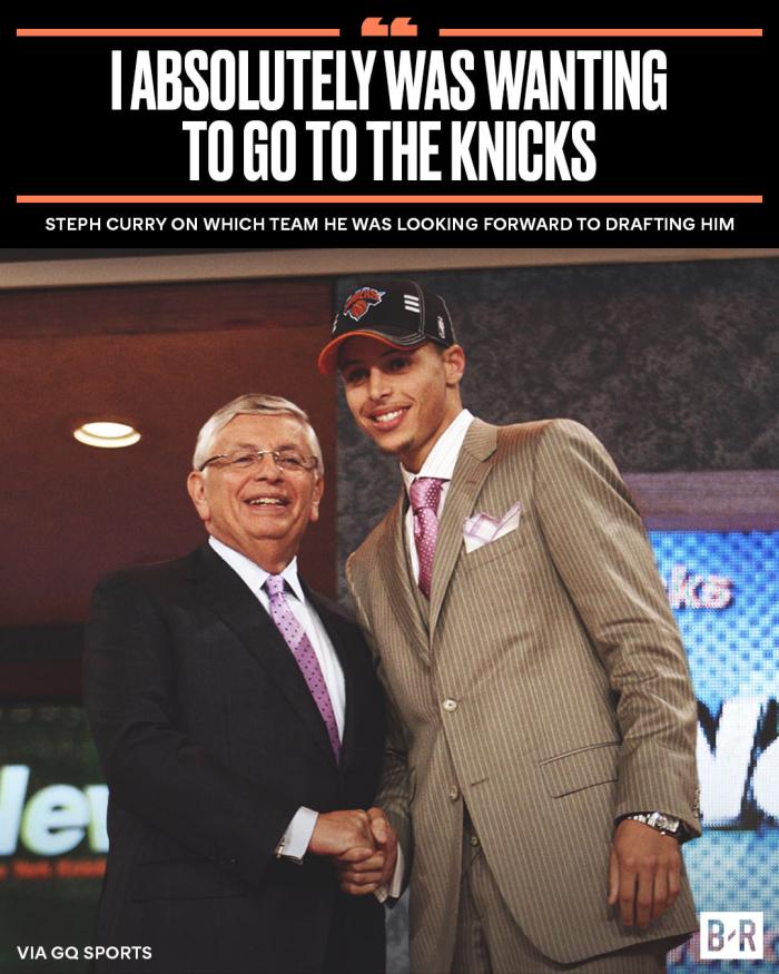 库里表示:我绝对想去纽约尼克斯。当时的选秀场地是在纽约,我父亲的生日是6月25日,还有我和尼克斯球队高管有很多沟通,他们说他们将会选我。当时有很多的炒作,所以我觉得我会为那里效力。但人们总说许愿要慎重,于是乎我现在顺理成章地成为了一名勇士球员。