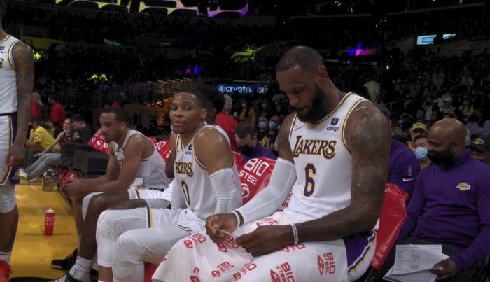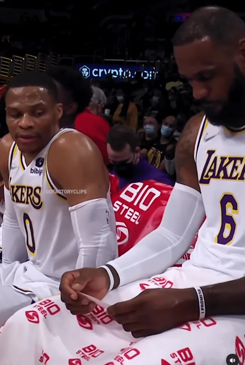 来源:24直播网01-11 09:4724直播网01月11日讯 ,美媒BasketballForever晒出湖人替补席罕见一幕,并且配文写道:当勒布朗检查统计表时,威少很紧张;视频中配文写道:威少希望詹姆斯不要看到他的数据。