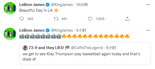 一球迷发推:今天我们将再次看到克莱打比赛,这件事真是太酷了;詹姆斯转发该动态,并且配上一系列表情,为克莱复出疯狂打CALL。