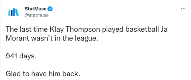 美媒Statmuse写道:“上一次汤普森打比赛时,莫兰特还没进入这个联盟。941天了,很高兴他能回来。”