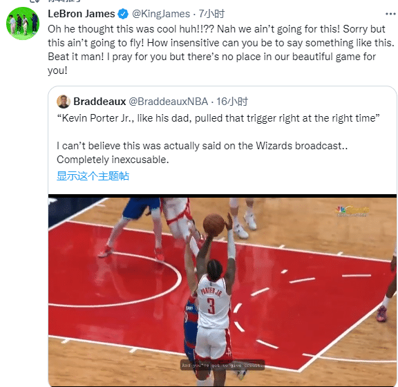 老詹还表示我并不是要他丢掉工作,我只是不同意他的错误言论:我从未见过那个人,我不认识他,我为他祈祷,就像我在推文中所说的那样。但我不能让这种评论围绕着一个尊敬我的人(小凯文-波特)。