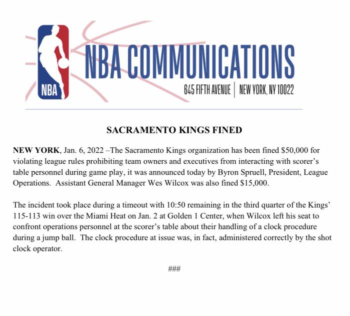 NBA公布罚款!国王违反规定被罚5万,总经理助理被罚1.5万