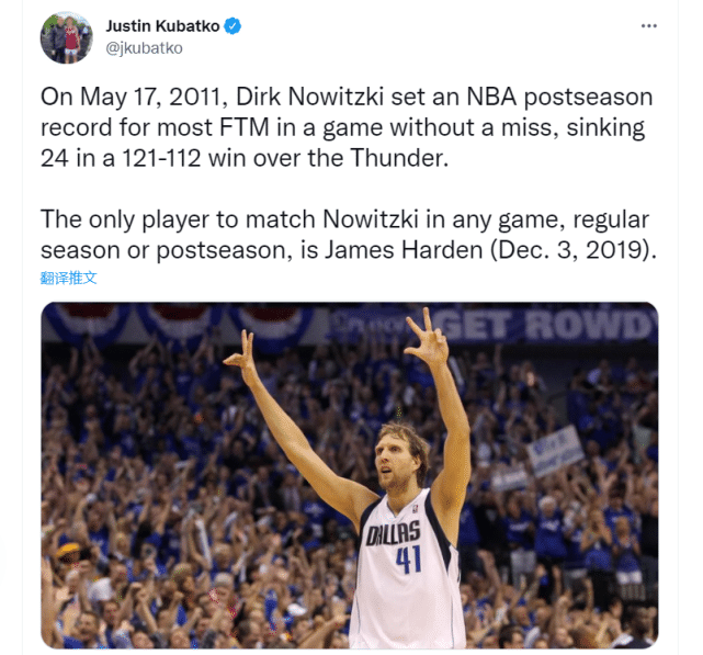 为了表示致敬,数据专家Justin Kubatko连续更推晒出了司机生涯各种传奇数据。在2001年5月14日,诺维茨基在季后赛对阵马刺的比赛中砍下42分18板6抢断,自从73-74赛季引入抢断数据以来,乔丹和司机是历史上仅有的2名能在季后赛单场送出至少40分15板5抢断的球员。