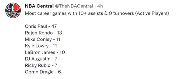 单场10+助攻零失误现役排名:保罗47次居首!詹皇10次威少1次