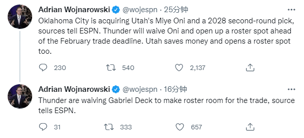 NBA又1笔交易达成!雷霆裁人获选秀权,爵士2换0省下240万