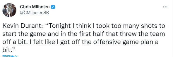 对于本场失利,杜兰特主动担责,KD表示:我想我今天在比赛开局阶段出手太多了。这让球队在上半场有些失控。我感觉自己有点脱离了球队的进攻计划。糟糕的开局是本场比赛失利的原因之一,我们必须打出更好的开局。