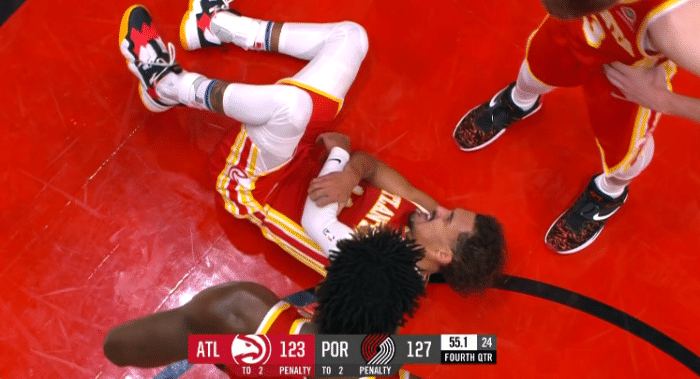 第二节,老鹰和开拓者展开拉锯战,打着打着老鹰断电,瞬间落后到13分,见状特雷-杨再次疯狂得分,连续五次罚全部命中,外线轰进三分,半场结束前3秒,更是投进不讲理logo式超远三分,短短144秒独砍13分,半场轰下29分,老鹰半场落后5分。