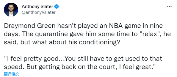 目前格林已经解除隔离,对于自己的身体状态,格林表示:他感觉很好,你仍然需要适应那种速度。但是回到球场上,我感觉很棒。