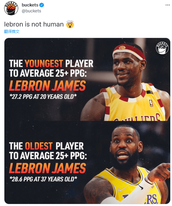 詹姆斯不仅是史上最年轻场均得分25+球员,也是史上最老场均得分25+的球员,如此数据对比更凸显老詹的不可思议,美媒直呼勒布朗不是人类。
