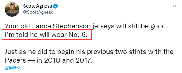 史蒂芬森重返步行者!曝改穿6号球衣,曾身穿湖人6号联手詹姆斯