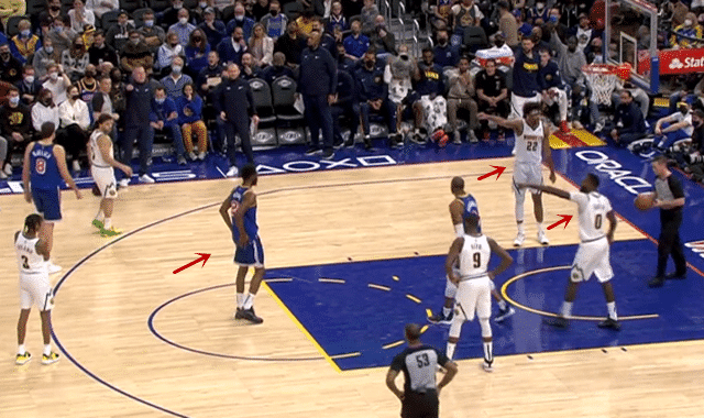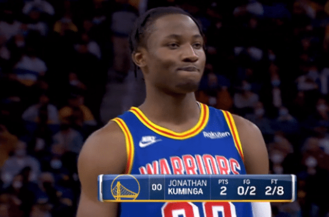 或许是将18分认为是自己腰疼线,在对阵掘金队的比赛中,维金斯急中生智的一幕也是让现场的裁判哭笑不得。比赛来到第三节末端,勇士的库明加被犯规,这个这家伙愁得,要知道此前他已经8罚2中,篮筐都快被打歪了。