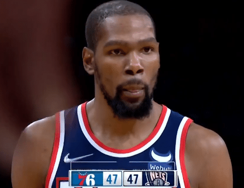 下半场,杜兰特和哈登扛起篮网进攻大旗,和费城打得十分胶着——哈登连得5分,杜兰特连得4分,随后哈登三分造犯规三罚全中;第三节后半段,杜兰特开启杀神模式——迎着防守干拔跳投,连续命中两记三分,连得8分打停费城,哈登连续三次助攻占一半的功劳,暂停回来,杜兰特继续中投,单节独砍14分,可费城连中四记三分反超比分。